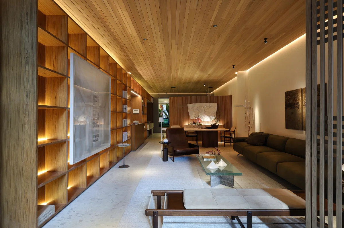 Desde a entrada, os visitantes são recebidos por uma imponente porta em um muxarabi desconstruído, de três metros de altura, feita em BP Freijó da Criare, que permite a entrada de luz natural através das vidraças do Conjunto Nacional, criando uma atmosfera poética e convidativa.