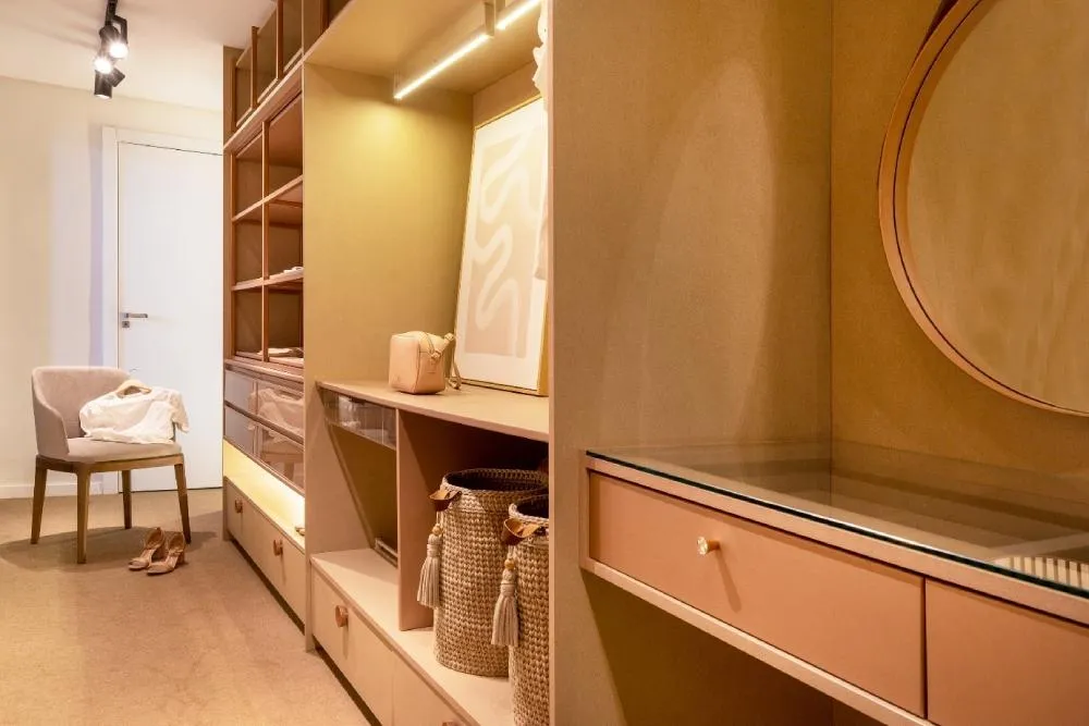 Além da organização pensada para o seu Closet, a escolha de materiais e cores que se harmonizam com o resto do ambiente é essencial para criar um espaço atraente e coeso.