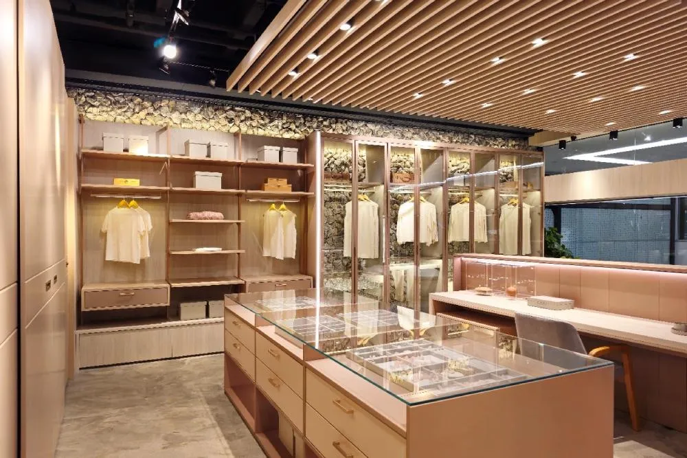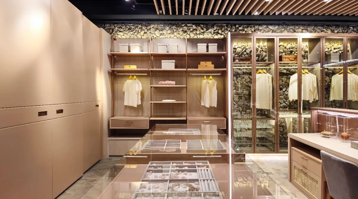 A harmonia de cores e materiais em um Closet aberto, com design elegante.