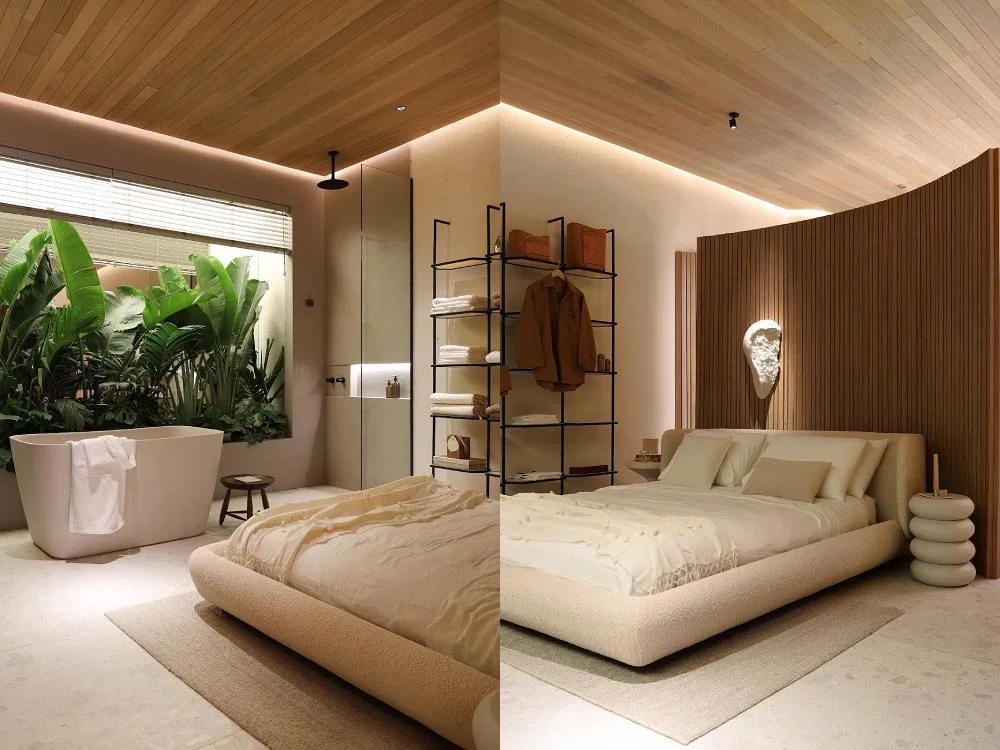 Opte por cores neutras, terrosas ou suaves, que harmonizem com o ambiente sem sobrecarregar os sentidos. Materiais naturais como madeira maciça, bambu e linho são essenciais no Wabi-sabi, ao trazerem a textura e a simplicidade do mundo natural para dentro de casa. Móveis planejados em madeira, com acabamentos que ressaltam a sua textura natural, são especialmente apropriados.
