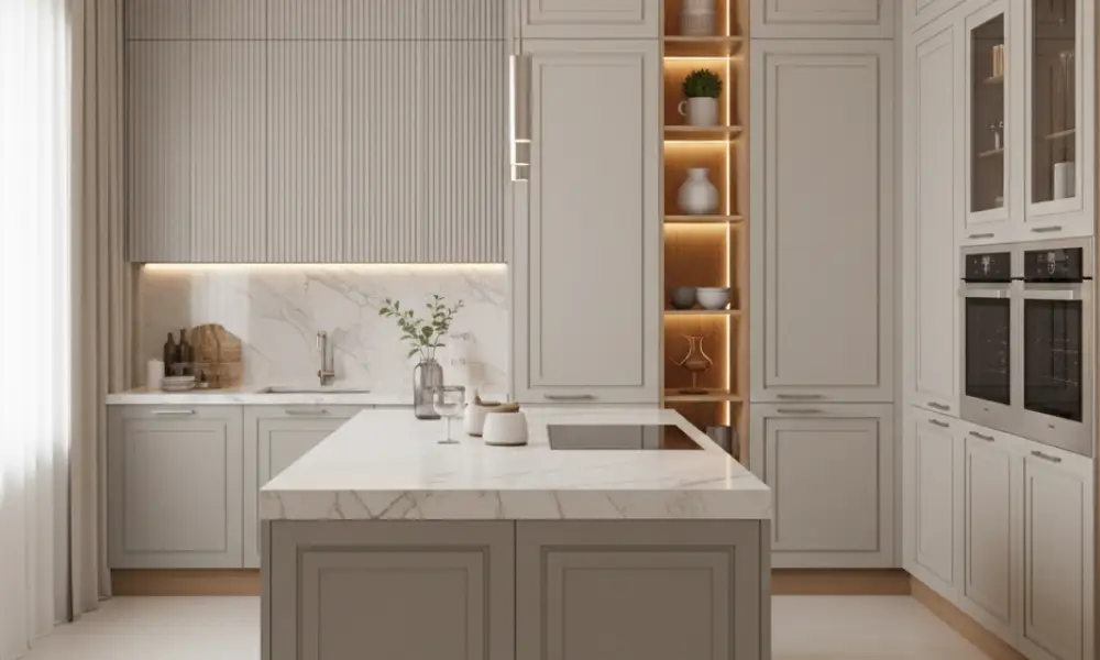 Cozinhas planejadas ganham elegância com molduras finas, frisos e paletas neutras, trazendo a leveza da estética grega e a imponência equilibrada dos romanos. A organização visual e a proporção correta tornam o ambiente mais luminoso e convidativo.